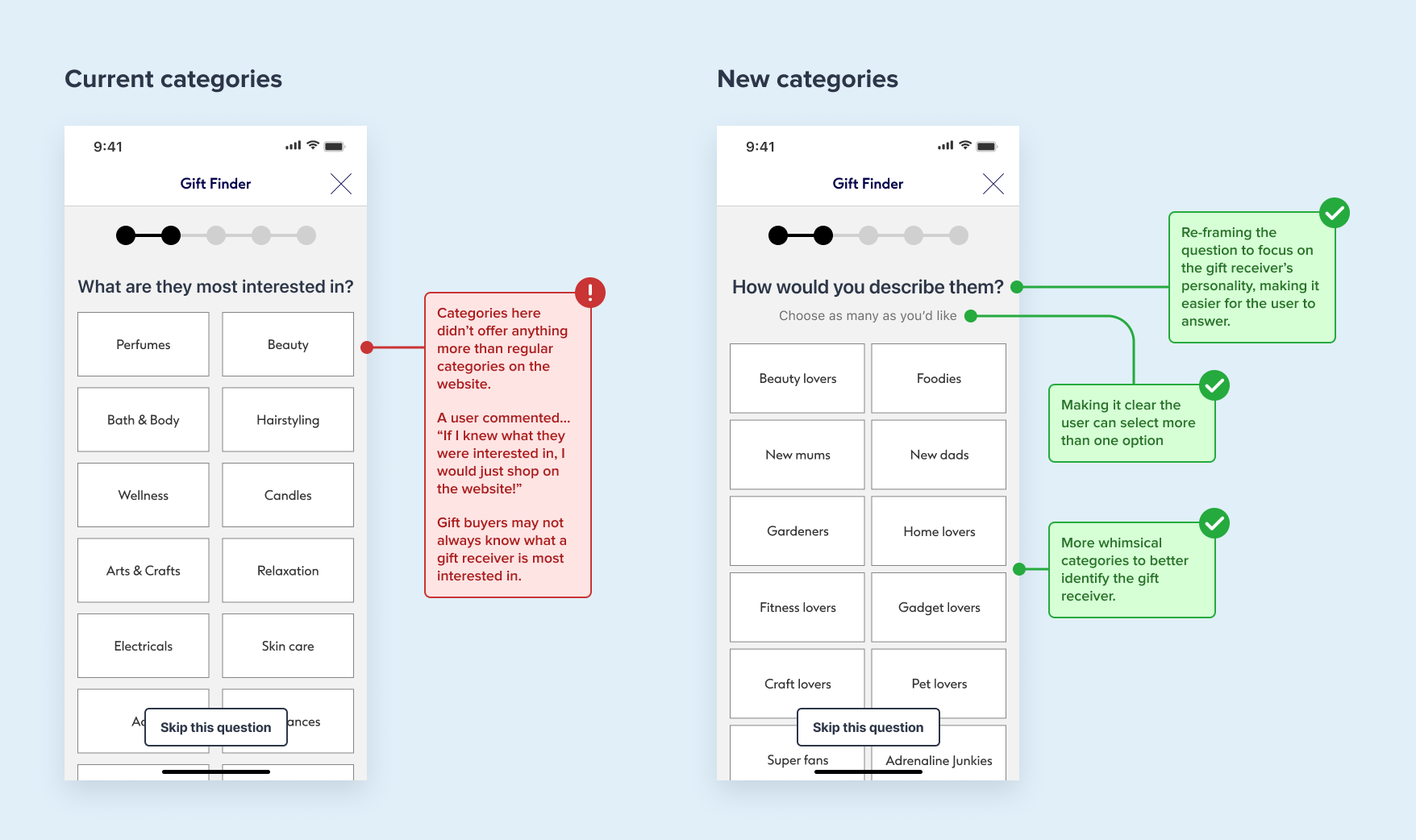 I reframed this by focusing on the recipient’s personality instead. This approach better supported users on subsequent pages. Some of these new categories already existed within the marketing team but hadn’t yet been integrated into backend systems.