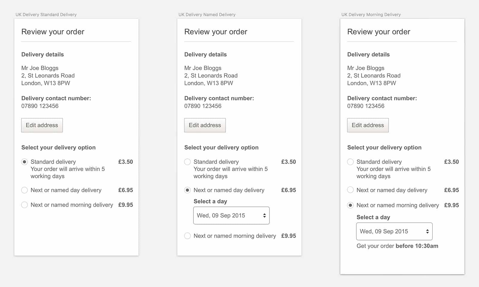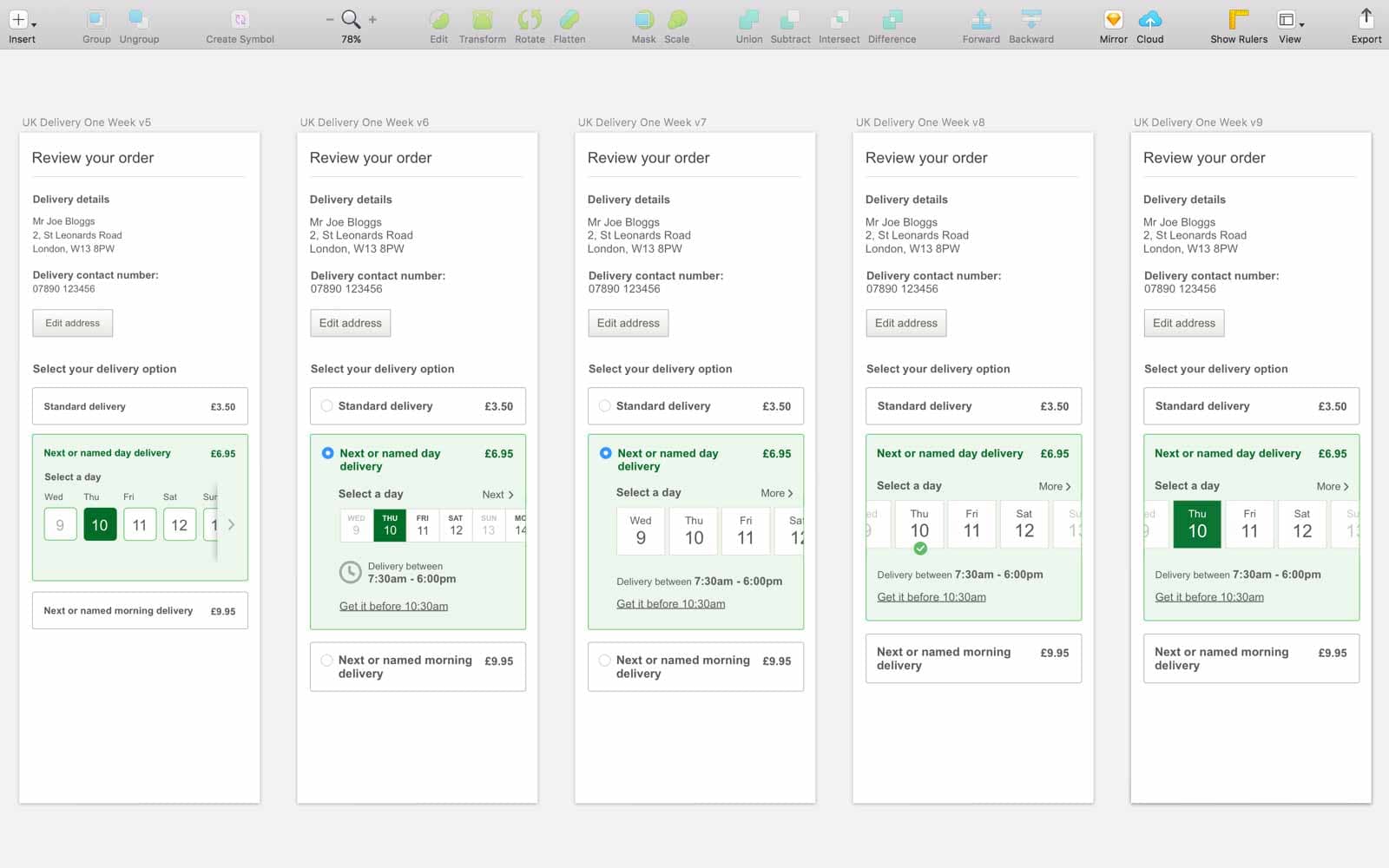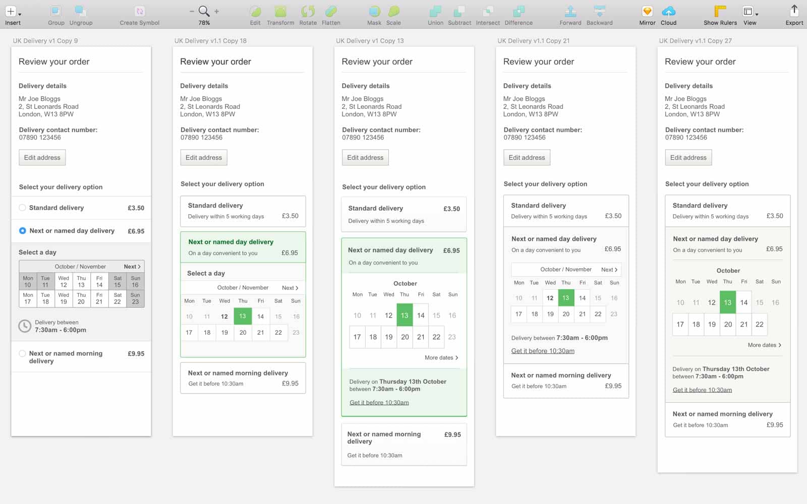After wireframing, two clear patterns started to emerge for the named day delivery option. I decided to jump into Sketch (the app) and mock up something more high fidelity.