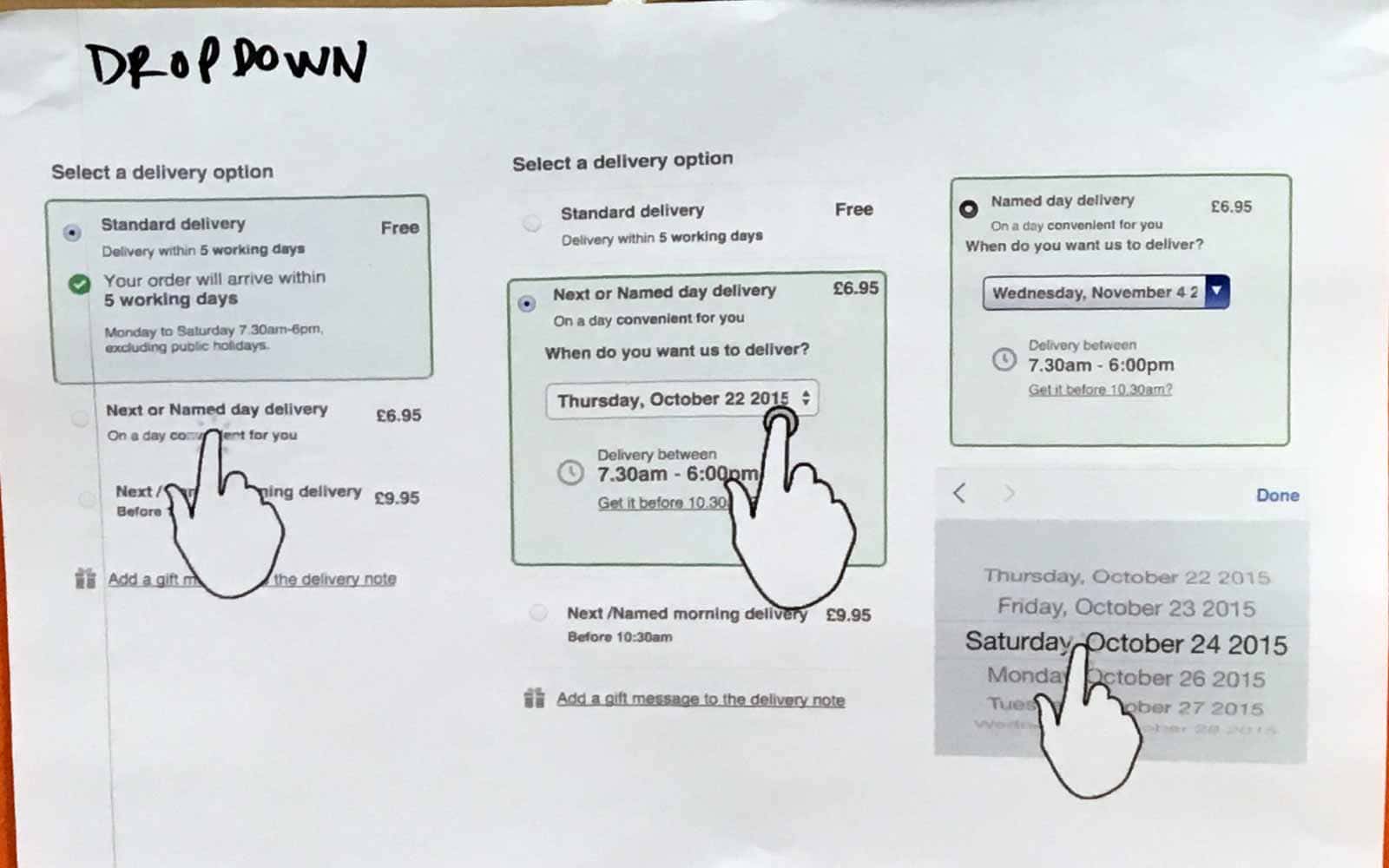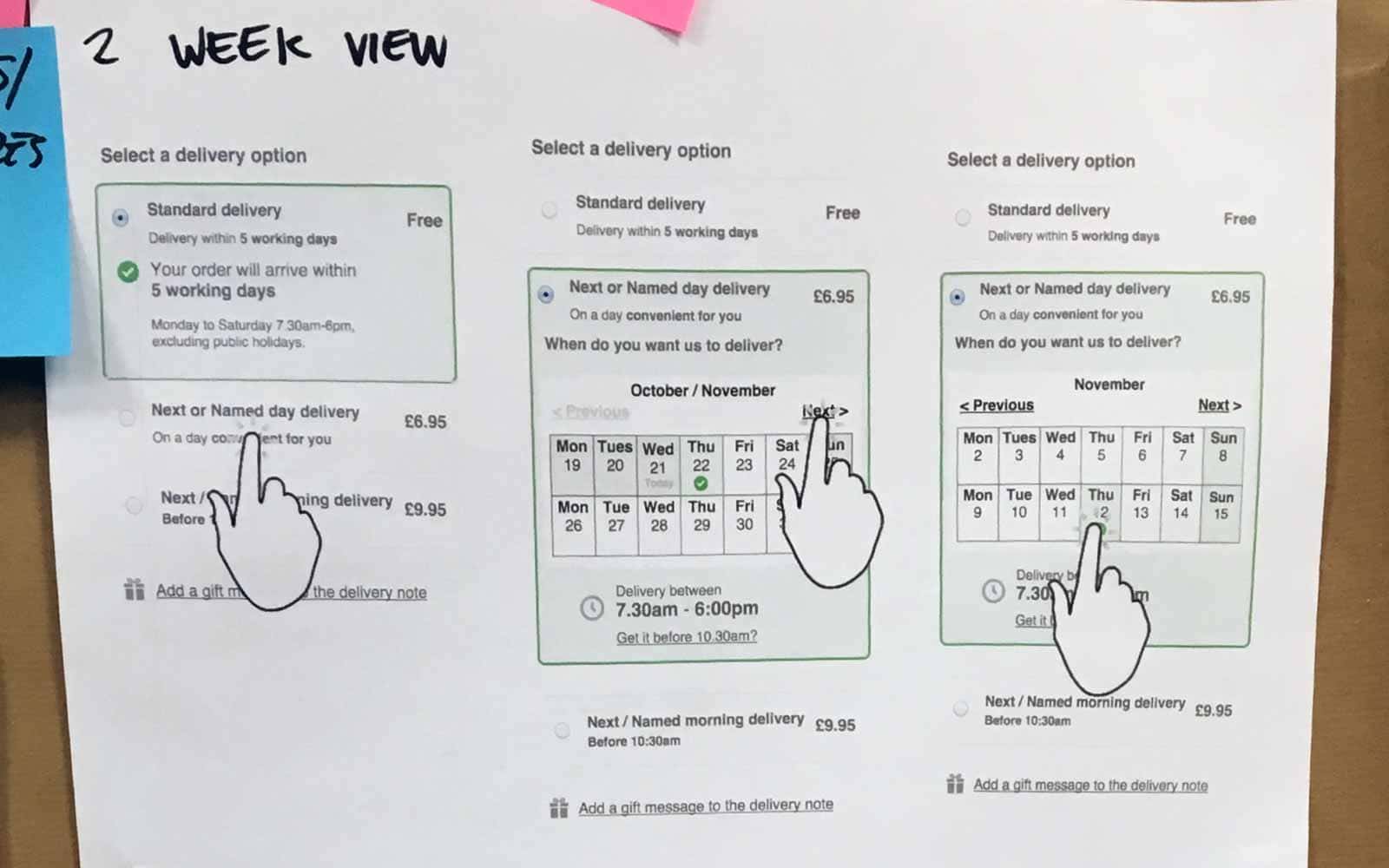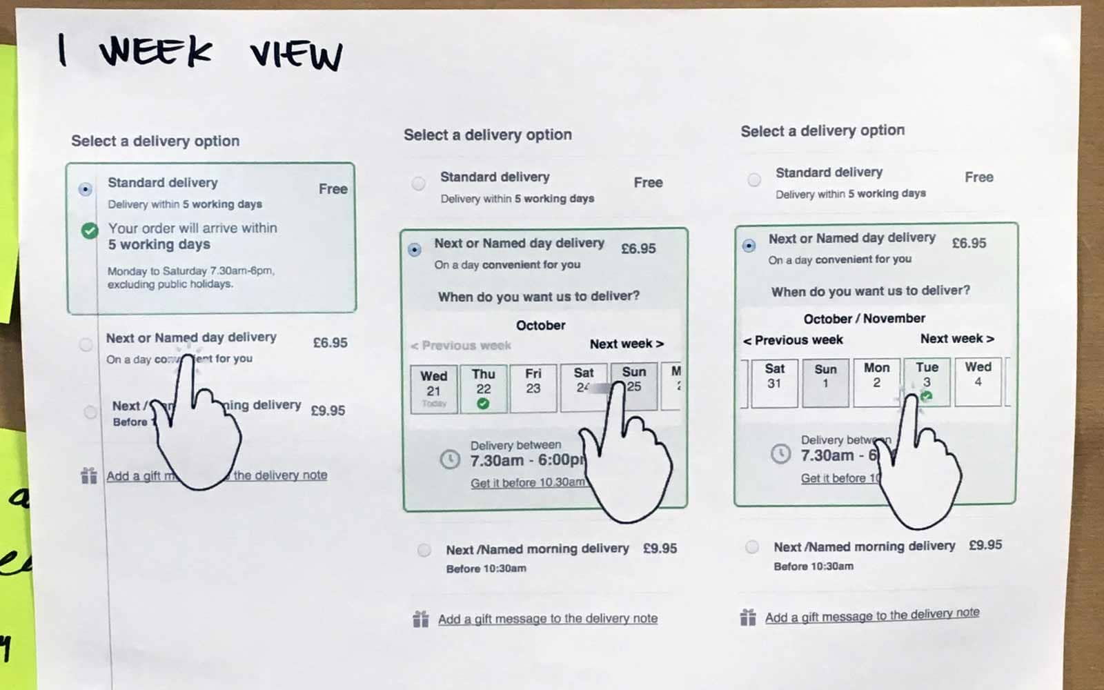 After wireframing, two clear patterns started to emerge for the named day delivery option. I decided to jump into Sketch (the app) and mock up something more high fidelity.
