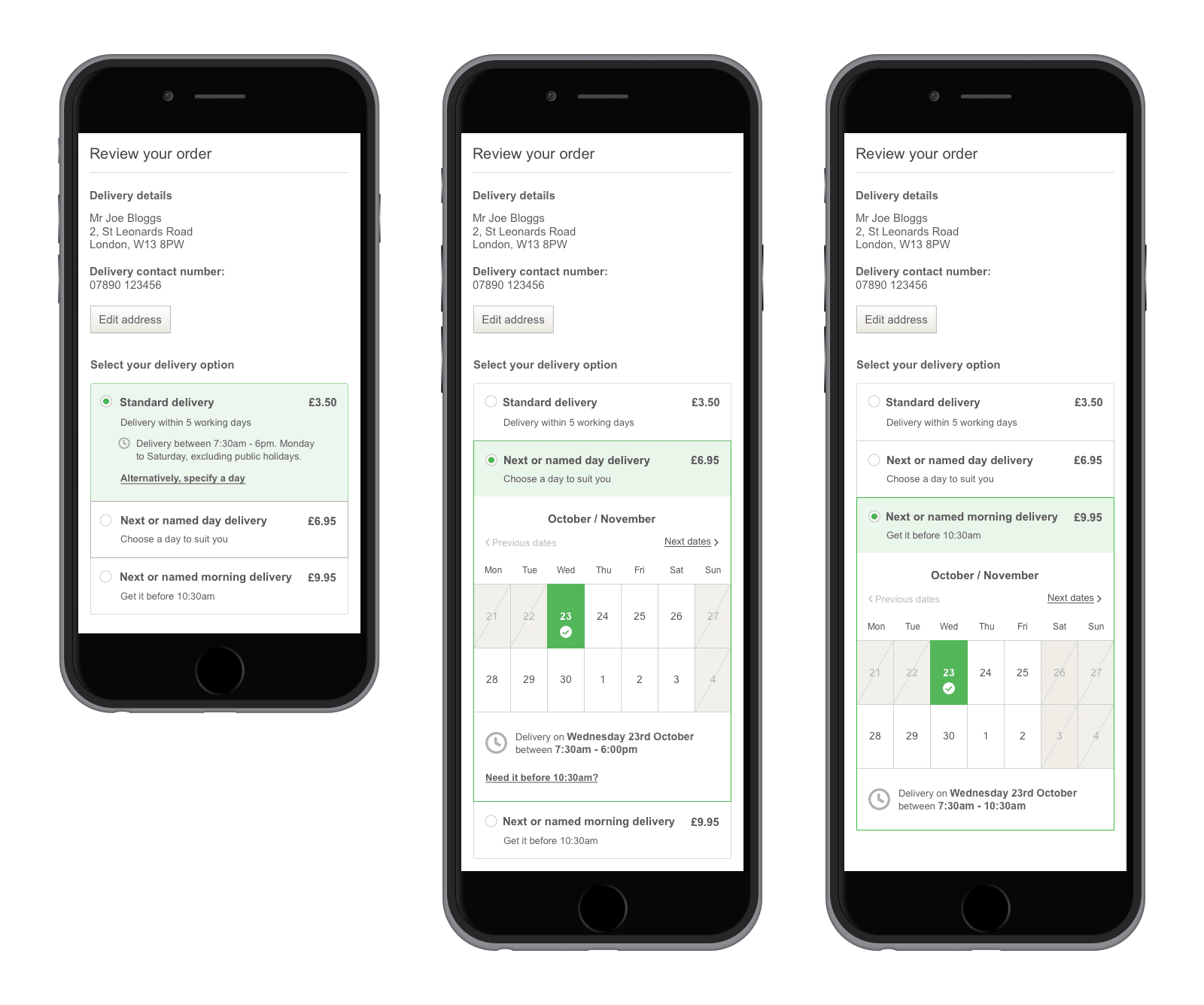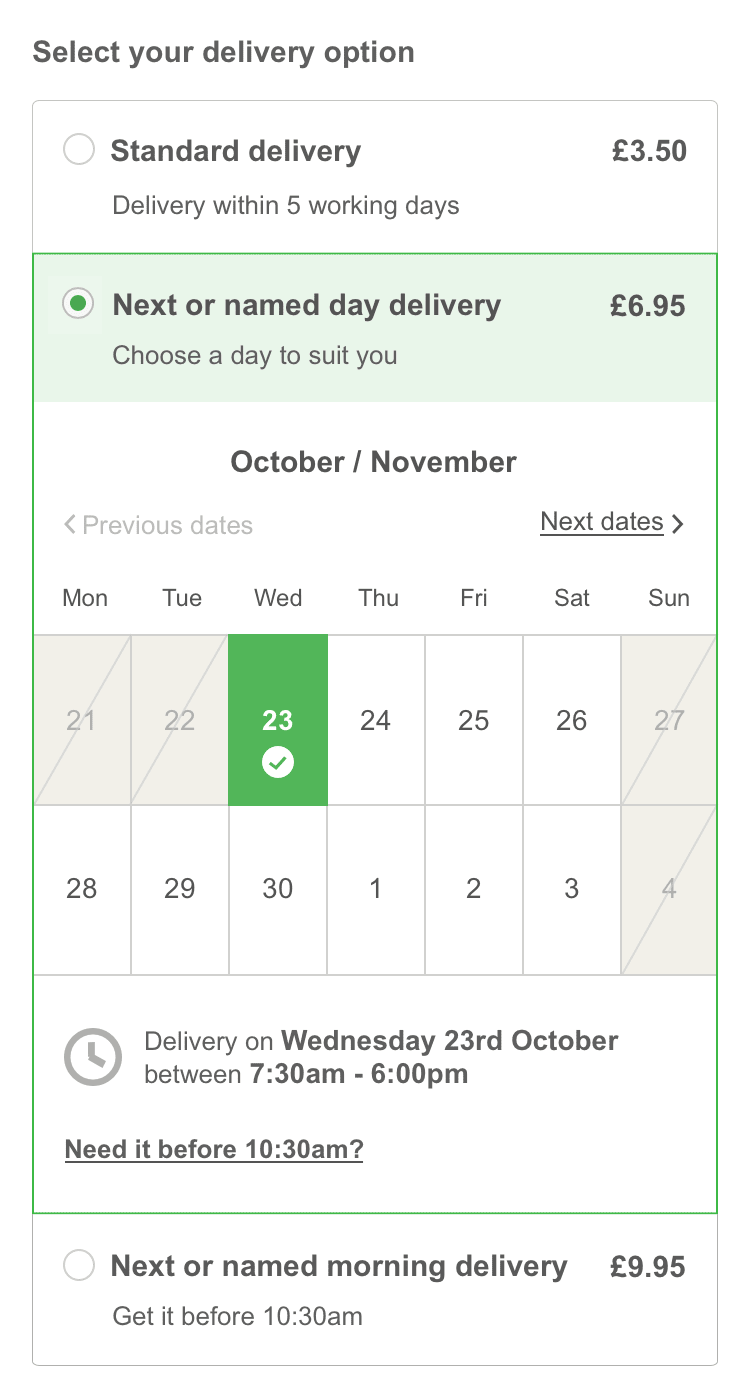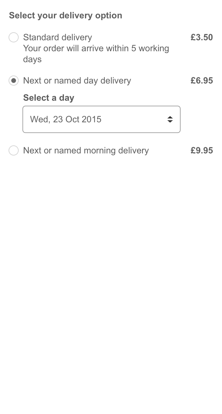 There were three clear options: 'Standard delivery', 'Next or named day delivery' and 'Next or named morning delivery'. These were presented as radio buttons with the available dates presented via a dropdown menu.