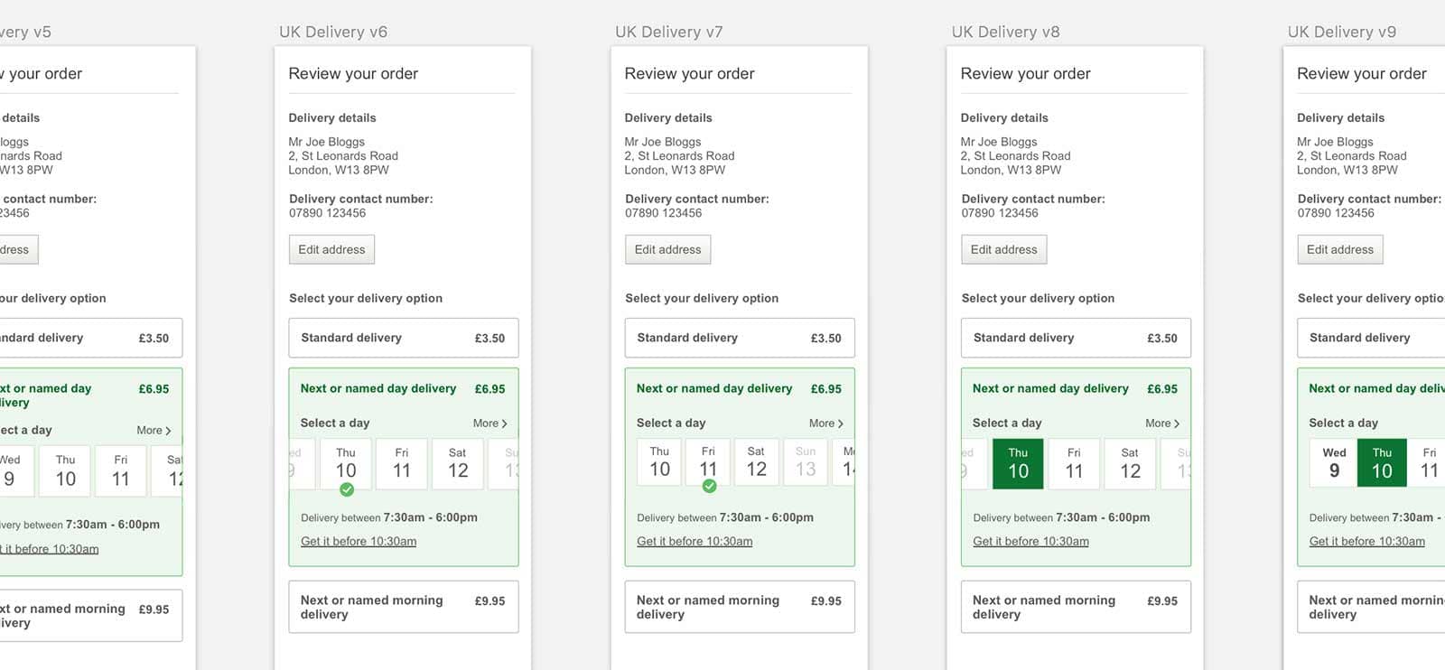 The new visual grouping makes the information easier to process and is also aided by bringing in the brand colour to highlight the selected delivery option.